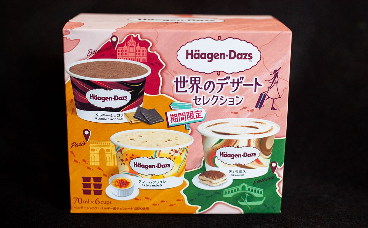 2025年10月21日(火)、ハーゲンダッツの新商品として発売されたのが、アソートボックス「世界のデザート セレクション(クレームブリュレ・ベルギーショコラ・ティラミス)」。希望小売価格が税込1074円とお高めではありますが、70mlのカップが全部で6個入っています。