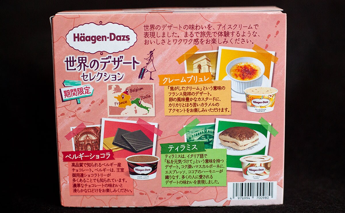 2025年10月21日(火)、ハーゲンダッツの新商品として発売されたのが、アソートボックス「世界のデザート セレクション(クレームブリュレ・ベルギーショコラ・ティラミス)」。希望小売価格が税込1074円とお高めではありますが、70mlのカップが全部で6個入っています。