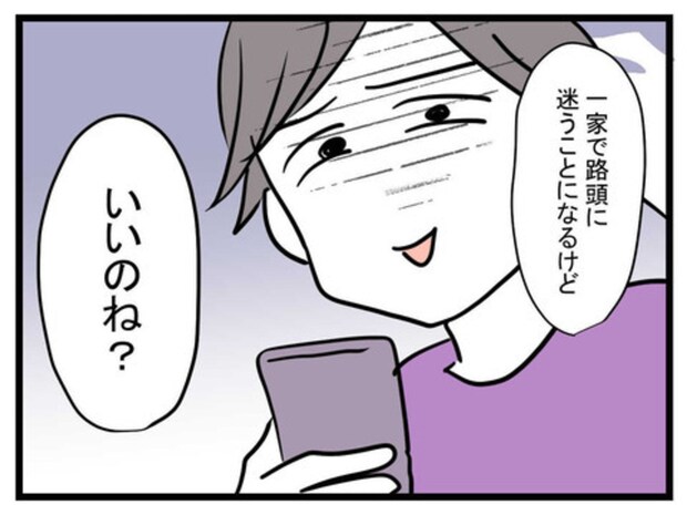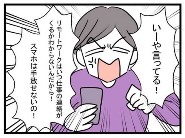 すぐるは「スマホは二度と見ない」と、極論をいい始めます。仕事もできなくなるし、「一家で路頭にまよう」と、おどすようなことをいう夫に、困惑する かすみさん…。 当初の「娘を見てて」というお願いに対しても、専業主婦なんだから、おんぶして料理をしろと言う始末で…。