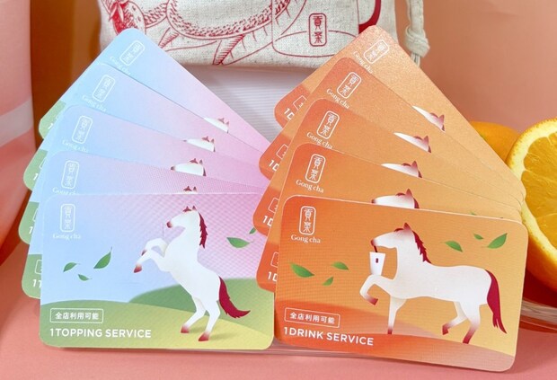 ドリンク・トッピングのフリーチケットは、2026年の干支「午」に合わせて、馬をデザインした。