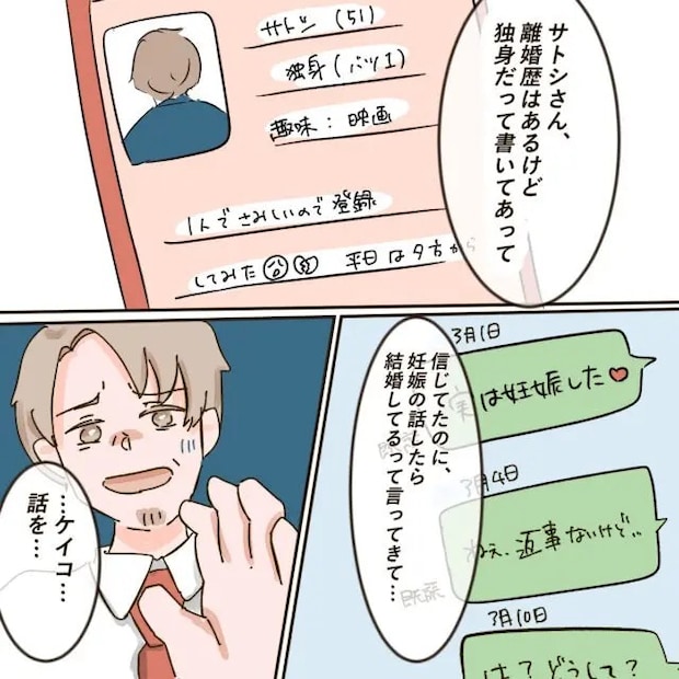 アプリ内のプロフィールを見ながら、「サトシさん、離婚歴はあるけど独身だって書いてあって。信じてたのに、妊娠の話したら結婚してるって言ってきて・・」アイさんの言葉を遮るように、「・・ケイコ・・話を・・」と動揺する夫に、