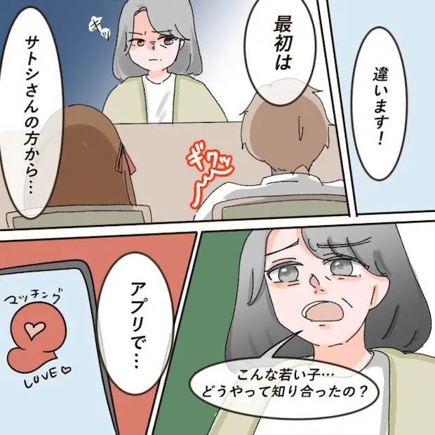 「違います!」と即答するアイさんは、「最初は、サトシさんの方から・・」と言い、それを聞いて夫をギロリと睨むと、視線に気づいて絶句。「こんな若い子・・どうやって知り合ったの?」とたずねると、「アプリで・・」とアイさんが答えました。