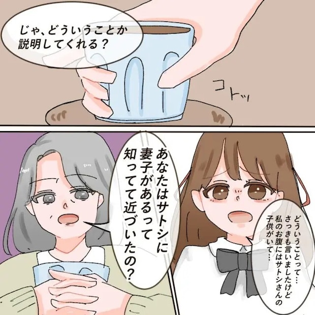 そして、「じゃ、どういうことか説明してくれる?」とたずねると、「どういうことって・・さっきも言いましたけど私のお腹にはサトシさんの子どもがいて・・」と答えるアイさんに、「あなたはサトシに妻子があると知ってて近づいたの?
