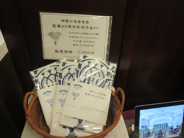 食堂内には昭和8年頃の御影公会堂・御影公会堂食堂や英語とフランス語が併記されているメニューの写真が飾られていて、創業90周年記念手ぬぐい(1,000)円も販売されています。