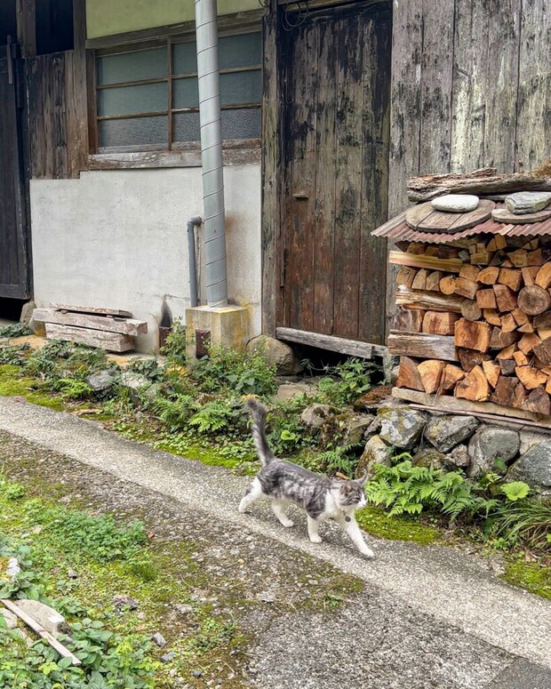 集落の路地(六尺道)を歩いていると、首に鈴をつけた一匹の猫がお散歩中。