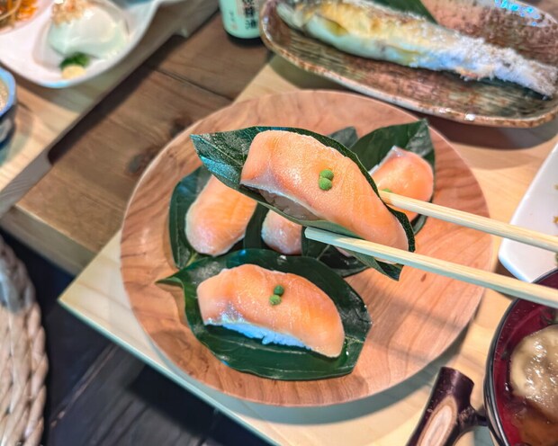 智頭町の名産・柿の葉に、軽く酢でしめた鱒の切り身を酢飯の上にのせた「柿の葉ずし」。