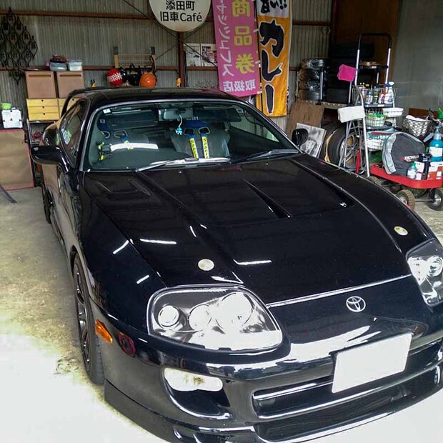 お店の前では、オーナーが所有するA80型スープラと、愛機・ホンダ ジョルカブがお出迎え。