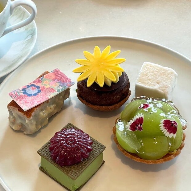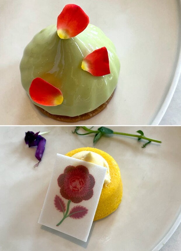 そんなセイボリーで印象的だったのが、「豆腐クリームチーズのムース 柑橘の香り 花びらを散りばめた出汁のジュレ(左手前)」です。大豆のうまみが濃縮されたムースはほっこり、癒される味わい。柑橘の清涼感ある香りと芳醇な出汁が効いており、和の要素も堪能できました。
