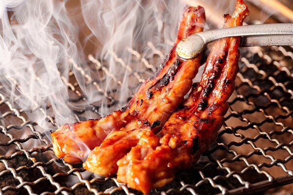 店内で捌いた地鶏と鴨を目の前の囲炉裏で炭火焼きにする、新感覚の焼き鳥が楽しめる「鶏焼肉」は、柔らかさと旨味が官能的に広がる逸品。