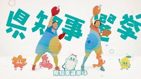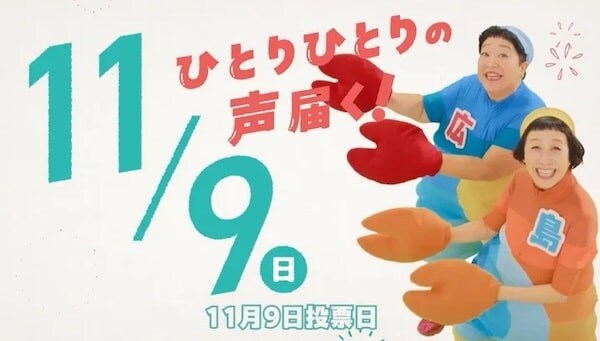ケロポンズの平田明子(=ポン)さんは、広島県三次市の出身。投票日の語呂合わせにもなっている「ひとりひとり(1・1)の声届く(9)!」をキャッチコピーにし、YouTubeの再生回数が1.7億回を超える人気楽曲『エビカニクス』の替え歌にあわせて、広島県知事選挙をPRしている。