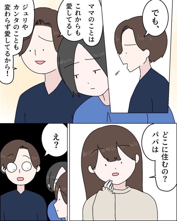 すると、「でも、ママのことはこれからも愛してるし、ジュリやカンタのことも変わらず愛してるから!」夫がそう言うと、「どこに住むの?パパは」と質問するジュリに、「え?」と驚く夫。