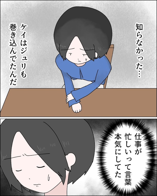 ひとりになった私はまた「知らなかった・・ケイはジュリも巻き込んでたんだ。仕事が忙しいって言葉、本気にしてた」と考え込んでいました。