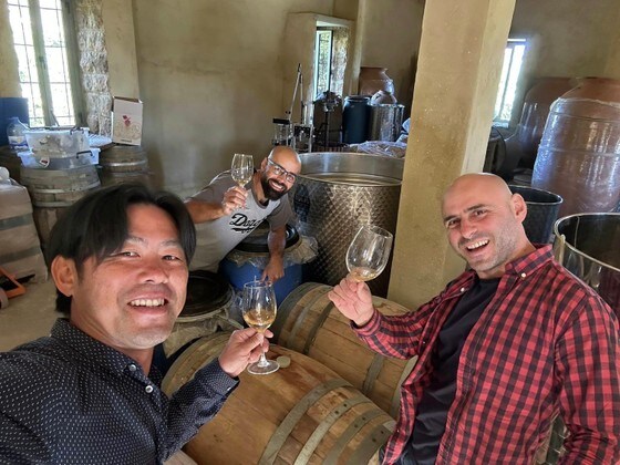 レバノンのメルセルワインのオーナー&ワインメーカーの、エディー・シャミさん(レバノン人、キリスト教徒)(写真右)と、アシスタントワンメーカーでシリア難民のアブダラ・リヒさん(イスラム教徒)(写真中央)