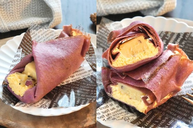 さつまいもらしい紫色のクレープ生地で、スイートポテトとカスタードホイップを包んだスイーツです。濃厚なスイートポテトでお腹も満たされる