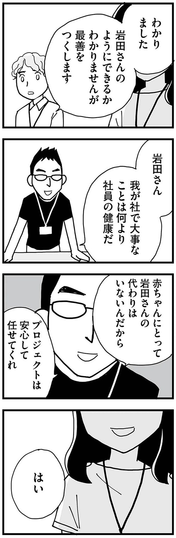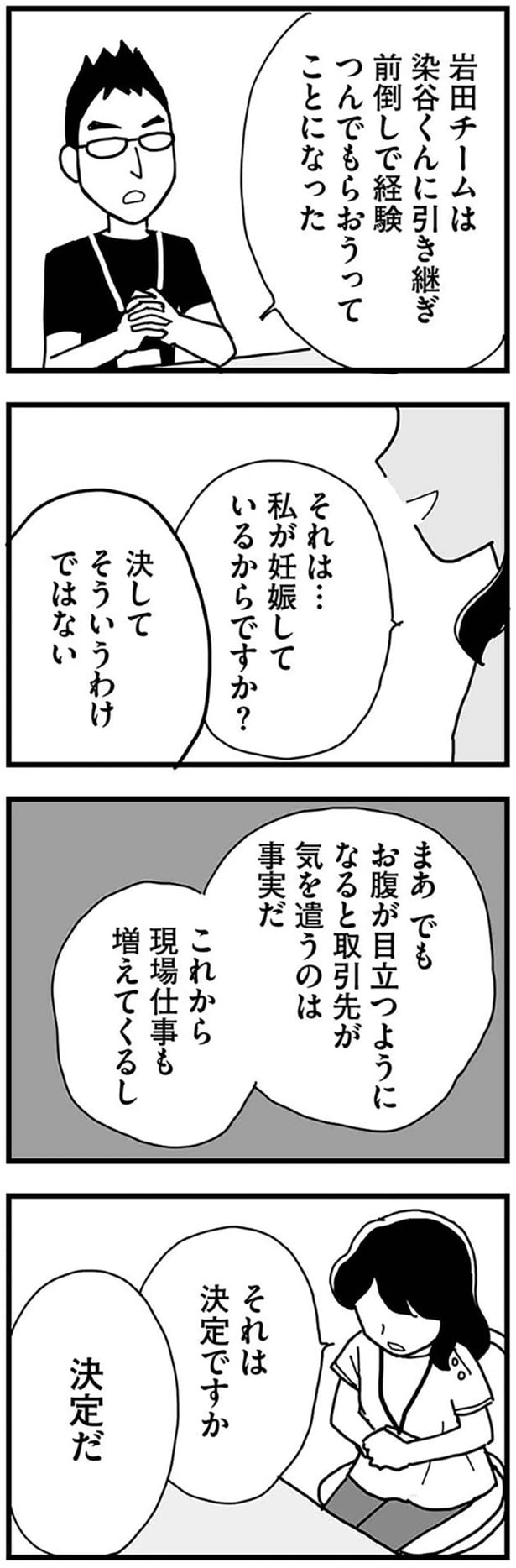前回、上司に妊娠を報告すると「タイミングが悪い」と言われてしまったちはる。それは自分が1番思っていたことだった。後日、上司に呼ばれたちはるは、チームリーダーを降りるように言われてしまい…。