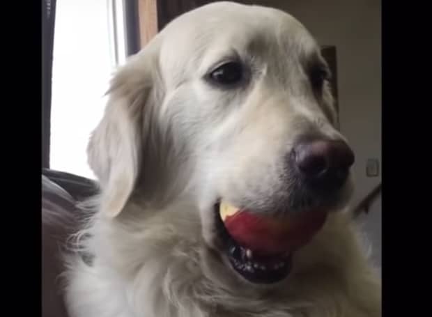 リンゴをボールのように咥えて誤魔化す作戦に!