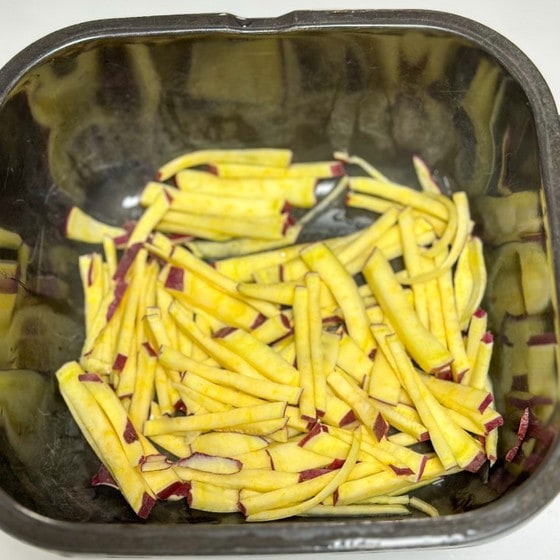 それではレシピの紹介です。 まずは秋の代名詞・さつまいもを細切りにし、水でさっとすすぎます。