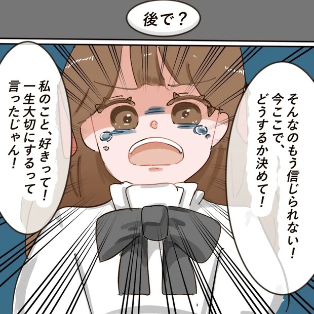 「後で?そんなのもう信じられない!今ここで、どうするか決めて!私のこと、好きって!一生大切にするって言ったじゃん!」アイさんがもう限界とばかりにまくし立てました。