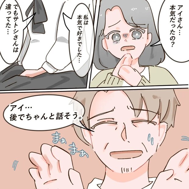 「アイさん・・本気だったの?」と驚いてたずねると、「私は本気で好きでした・・でもサトシさんは違ってた・・」落ち込む様子のアイさんに、「アイ・・後でちゃんと話そう」となだめるように夫が言うと、