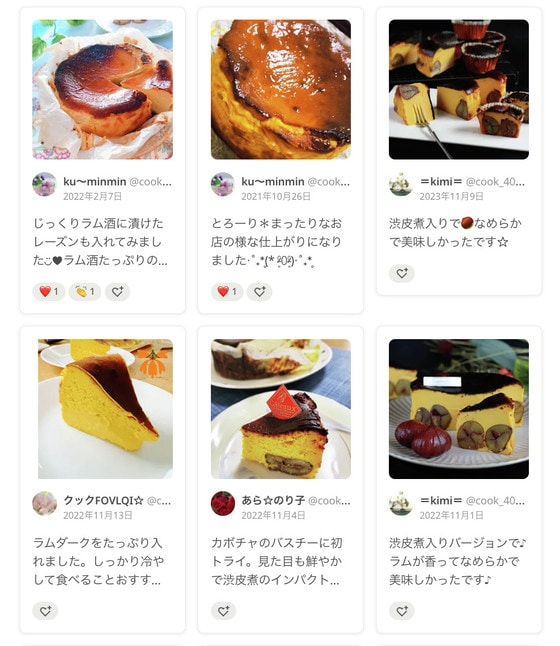 つくれぽ(つくりましたフォトレポートのこと)にも「かぼちゃとラム酒の相性抜群でほっこり美味しい~」「かぼちゃ入りバスクケーキ、焦がしが香ばしくて美味しいです」など、絶賛コメントがたくさん届いています。
