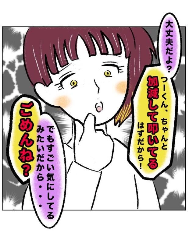 すると、複雑な表情を浮かべるまるさんとまーくんママに気付いたつーくんママは「大丈夫だよ?つーくん、ちゃんと加減して叩いてるはずだから!」と的外れなことを言い、「でも、すごい気にしてるみたいだから・・ごめんね?」と誠意の感じられない謝罪の言葉を口にしました。