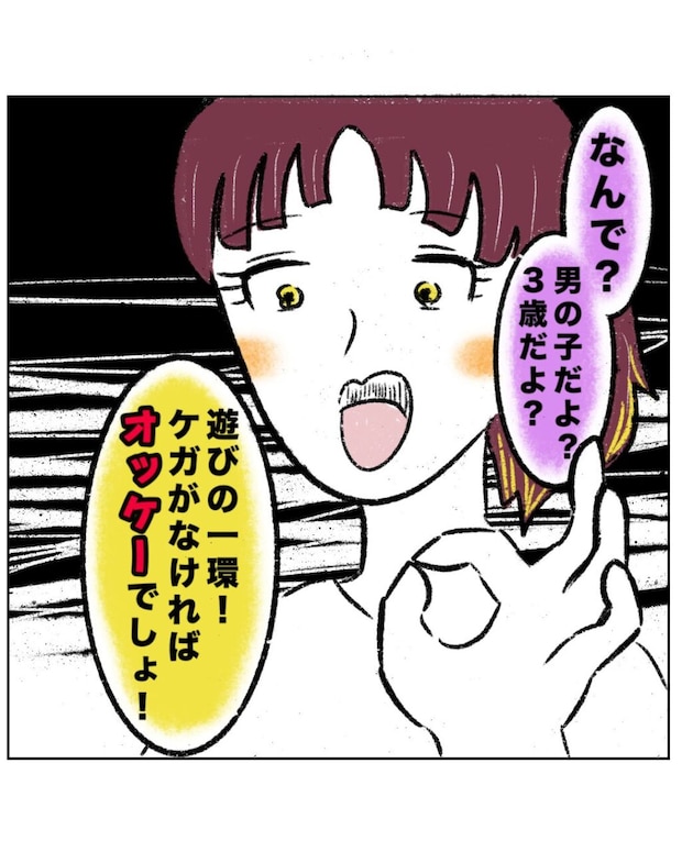 お友達のまーくんを叩いたつーくんを叱ることなく、叩かれたまーくんにやり返すようにけしかけるつーくんママにまるさんが「謝らせた方がいいと思う」と意見すると、つーくんママは「遊びの一環!ケガがなければオッケーでしょ!」とさらり。