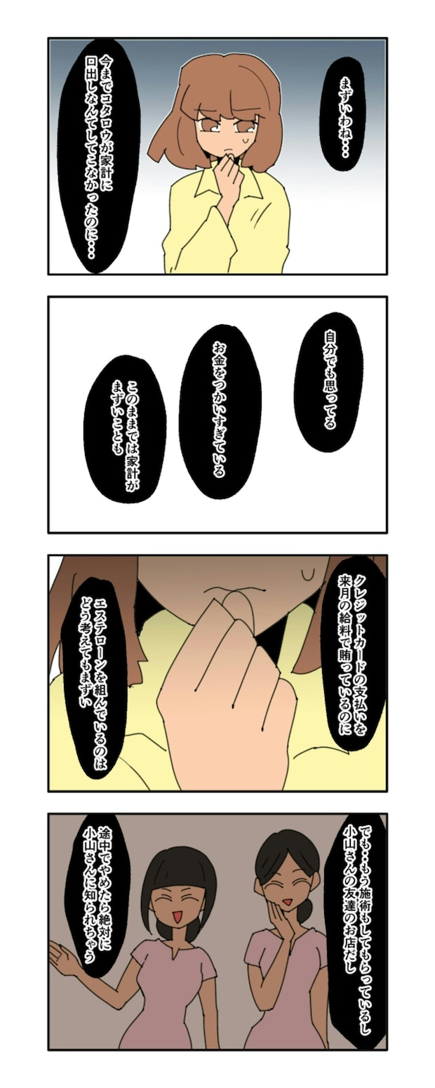 ハルミは、夫のコタロウに家計について口出しされたことで、自分が使い過ぎていることが夫に知られてしまったのではないかと心配しています。エステサロンや息子の習い事をやめようかとも考えましたが、ママ友たちの前で恥をかきたくないという思いから、結局やめることができませんでした。