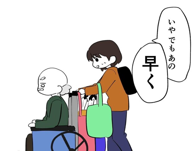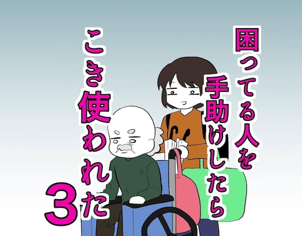 駅でおじいさんに、困っていると声をかけられたまいかわセミさんは、手伝いを快く請け負うことに。重たい荷物を持ってあげたり、おじいさんの目的地であるN駅までついて行ってあげ、デパートで車いすも借りてあげましたが、まだおじいさんの要求は止まりませんでした。