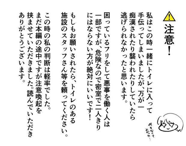 困っているふりをして、痴漢など犯罪行為をする事件も報道されています。体の不自由なおじいさんとはいえ、個室で2人きりになることは大変危険です。こういったケースでは店舗の職員を呼んで相談するなど、周囲への連携を第一に考えたいですね。