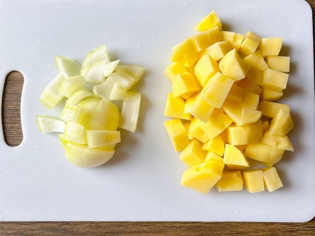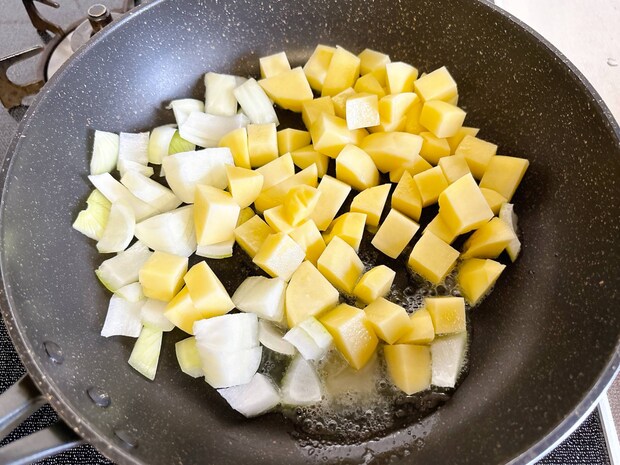 じゃがいもと玉ねぎは皮をむき、1cm角に切ります。