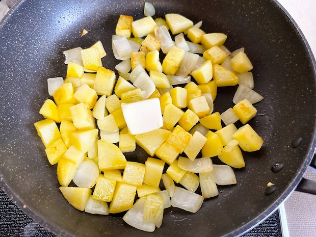 じゃがいもに火が通ったら、バター(無塩)10gを入れて全体に絡めます。