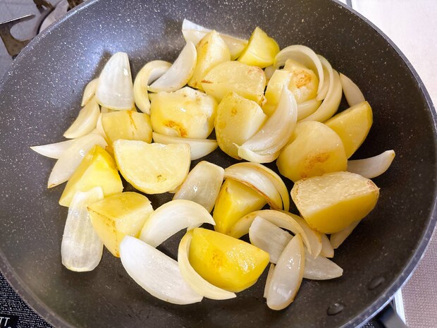 フライパンを中火にかけ、バター(無塩)10gを溶かし、玉ねぎとじゃがいもを炒めます。