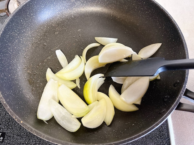 フライパンを中火にかけサラダ油大さじ1杯(分量外)をひき、玉ねぎを炒めます。