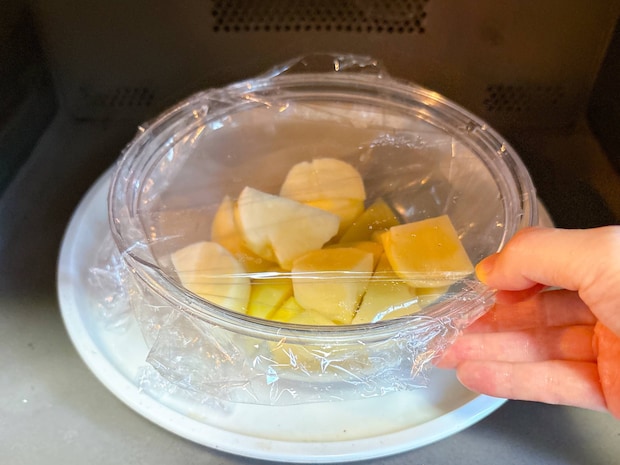 耐熱ボウルにじゃがいもを入れてラップをし、電子レンジ600Wで5分加熱します。