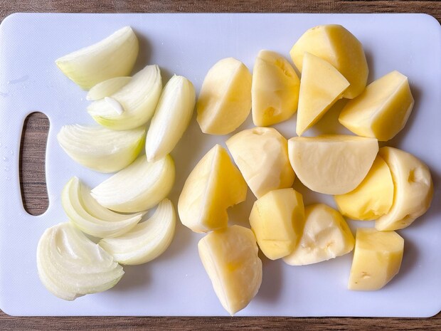 じゃがいもは皮をむいて乱切りにし、玉ねぎはくし切りにします。