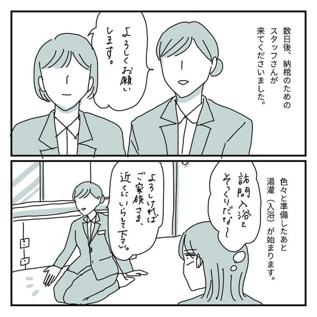 そして、納棺の日、驚くような体験をします。まさか、家族が参加しながら湯灌(ゆかん)を行うとは…。葬儀の新常識を知ったできことでした。