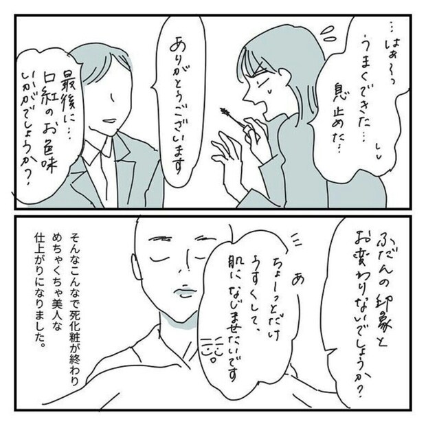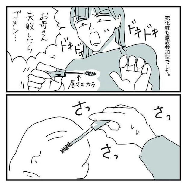 亡くなった母に、眉マスカラを施したキクチさん。「失敗したら…」と思うと不安で、プレッシャーがのしかかります。息を止めるほど、緊張したできごとでした。