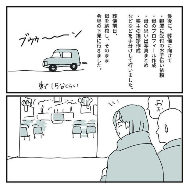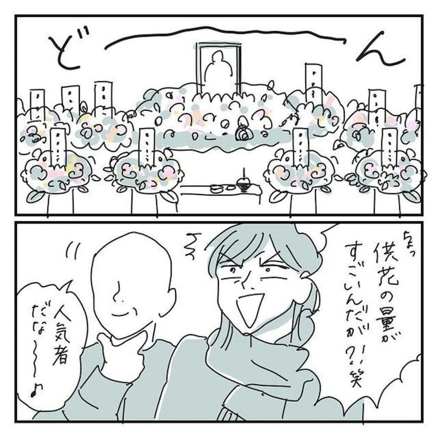 その後、葬儀場の下見へと出かけたキクチさん親子。すると、そこで目にしたのはたくさんの供花に、葬儀場スタッフの細やかな心配りが感じられる、温かい雰囲気でした。