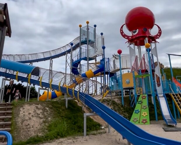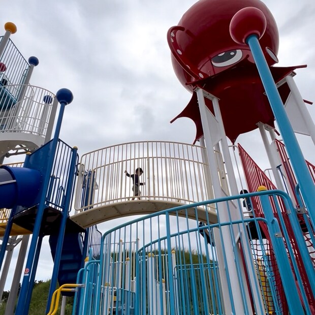 こちらは、大型スライダーとインクルーシブ遊具がそろっている大きなタコが目印の公園です。