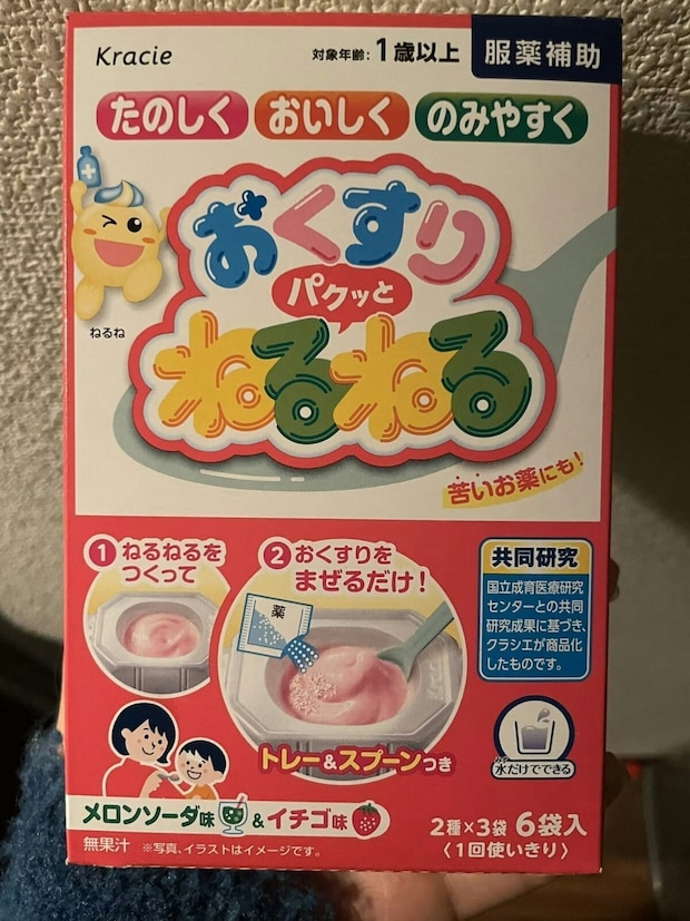 誰しも小さい時に食べた経験がある「ねるねるねるね」に、お薬を混ぜて飲めるというこの商品。筆者は初めて見たのですが、見た目は完全にお菓子のねるねるねるねですよね。メロンソーダ味とイチゴ味というのも美味しそうですし、これならお薬が苦手な子でもおやつ感覚で服薬できそう。自分で作る楽しさも感じられて、さらに味もおいしいとなると最高ですよね。