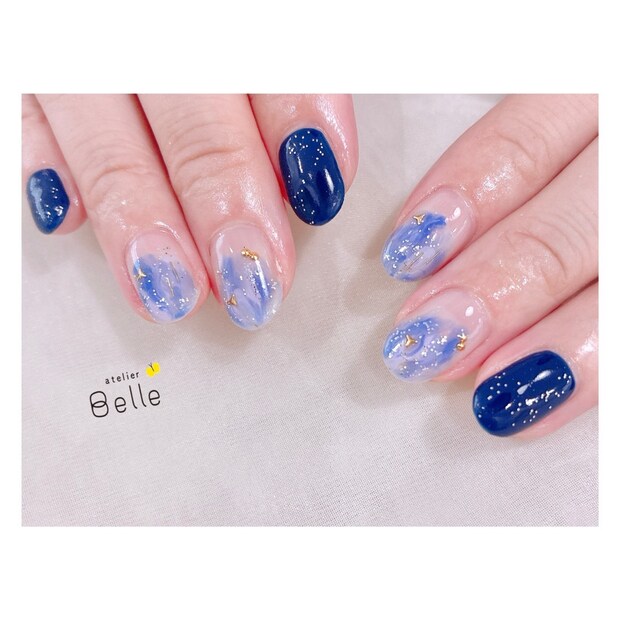 今回は、濃いネイビーと透け感のあるブルーのネイルカラーを重ねた、
