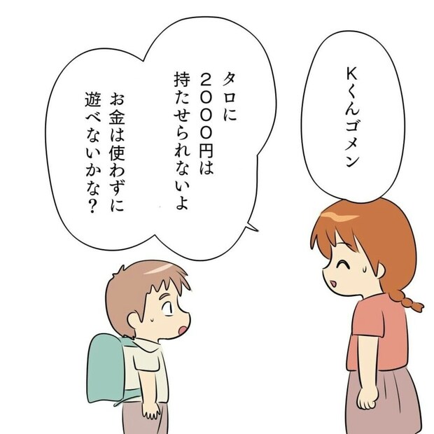 星河ばよさんは直接Kくんに2,000円は持たせられないということを伝えます。子ども同士でトラブルになる前に、親が間に入ってあげるとよいでしょう。お金を使わなくて楽しい遊びができることを伝えたり、家にあるお菓子を持ち寄るなどの具体的な提案をしてあげるなどもいいですね。