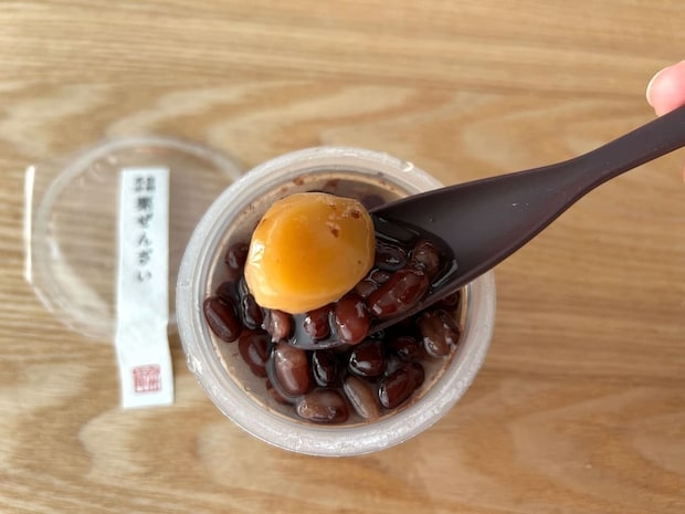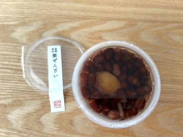 この栗は甘さが控えめになっており、ぜんざい全体の甘さと良いバランスです。緑茶や抹茶と合わせていただきたい味わいです。