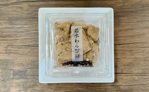 食べやすい一口サイズで、国産大豆のきな粉をまぶしたわらび餅。別添の黒蜜をかけて楽しみます!