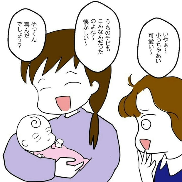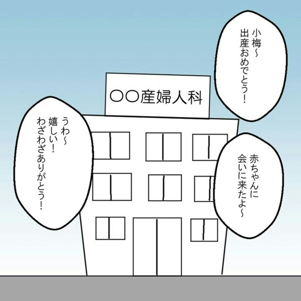 小梅さんは待望の第一子を出産します。さっそく2人の親友がお見舞いにやってきてくれて、赤ちゃんと対面します。大切な二人の親友がきてくれて小梅さんはうれしそう。