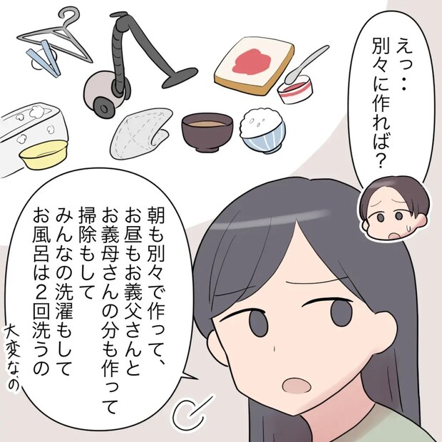「えっ・・別々に作れば?」と簡単に言うユウタに、「朝も別々で作ってて、お昼もお義父さんとお義母さんの分も作って掃除もして、みんなの洗濯もしてお風呂は2回洗うの。大変なの」ため息をつきながらそう言うと、