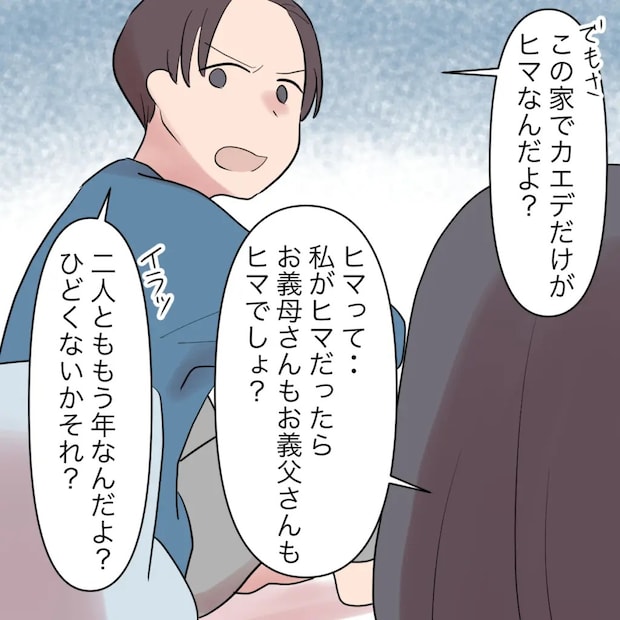 「でもさ、この家でカエデだけがヒマなんだよ?」と怒ったように言うユウタに、「ヒマって・・私がヒマだったら、お義母さんもお義父さんもヒマでしょ?」と反論すると、「二人とももう年なんだよ?ひどくないかそれ?」とユウタがイライラしながら答えました。