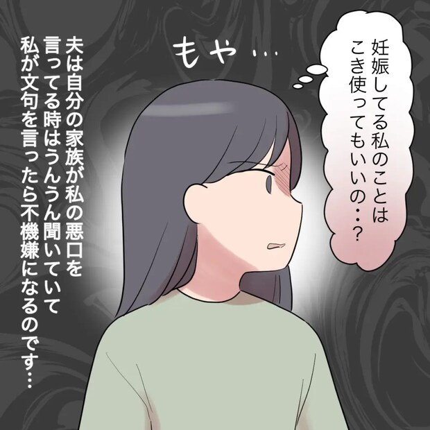 ユウタにそう言われて、「妊娠してる私のことはこき使ってもいいの・・?」とモヤモヤする私。夫は、自分の家族が私の悪口を言ってる時はうんうん聞いていて、私が文句を言ったら不機嫌になるのでした。