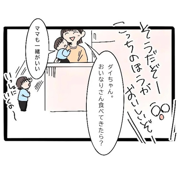 夫もダイを私に取られたくないのか「そうだぞーこっちのほうがおいしいぞー」と大きな声で呼びます。私は「ダイちゃん、おいなりさん食べてきたら?」と声をかけます。しかし、ダイは「ママも一緒がいい」と私の手を引いてリビングに連れて行きます。