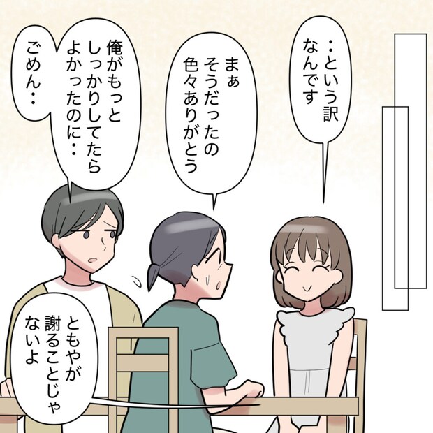 お義母さんに一緒に暮らそうと誘う、ともやさんとゆかりさん。これまでさんざん嫁いびりにあってきた義母ですが、これまで通り義実家に残るようです。義父と結婚したときに、人には分からない覚悟のようなものがあったのかもしれませんね。3人で息をひそめて見守っている義祖父母と義父が少しだけ可愛く見えました。